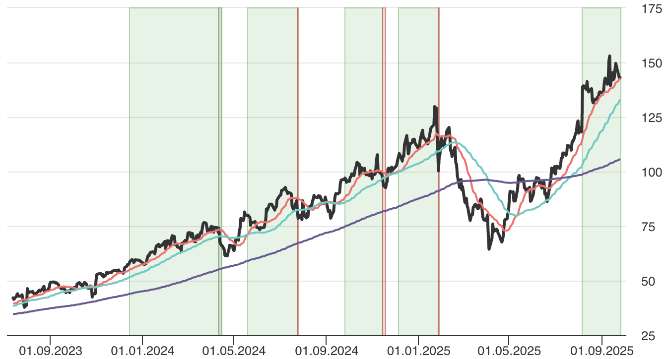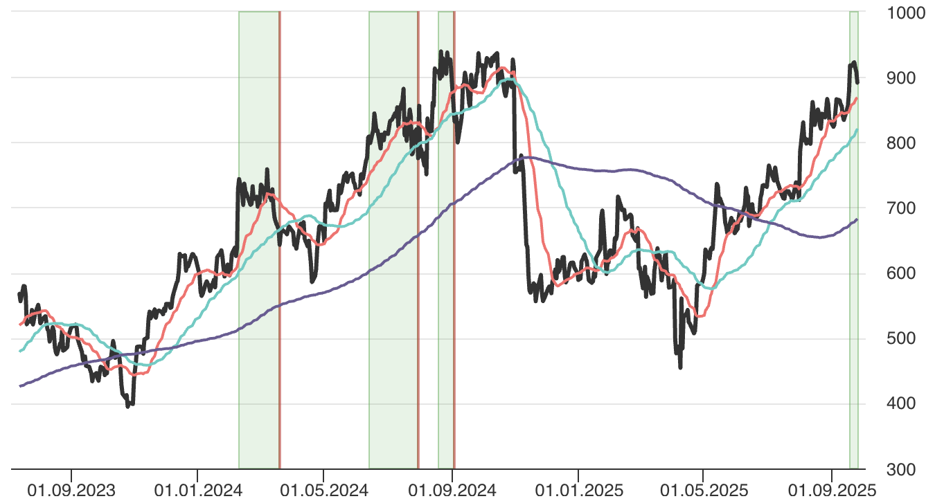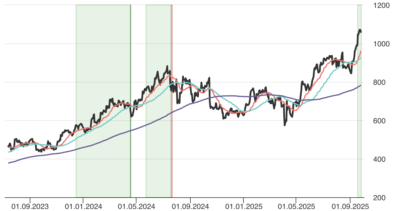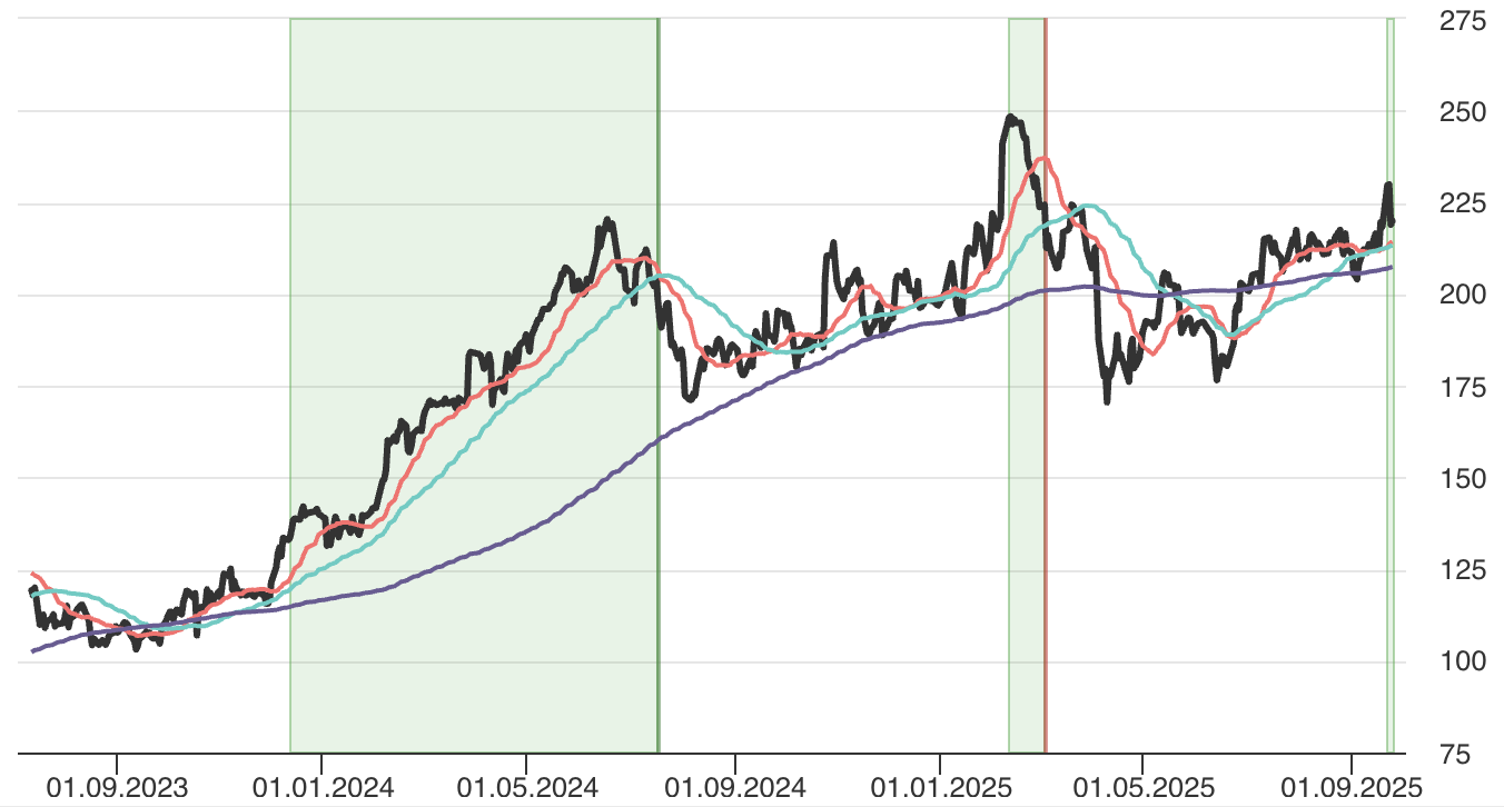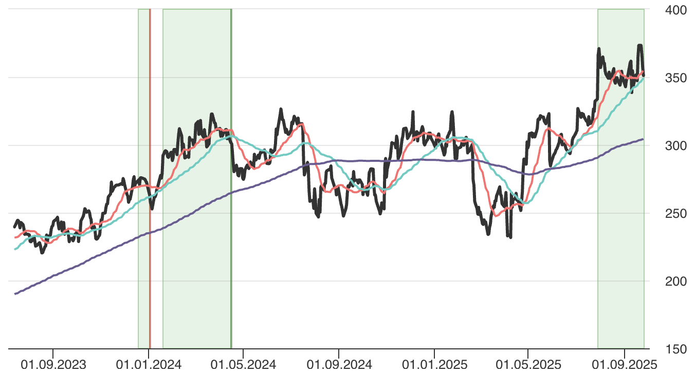 2025 helmi-huhtikuun heikot osakemarkkinat pitivät palautumisen aisoissa. Huhtikuun aikana kurssi pääsi vihdoin nousutrendiin kiinni ja ampaisi kohti SMA200:n trendikuvaajaa. SMA50 ylitti kuvaajan heinäkuun alussa antean samalla signaalin siirtymästä pitkän aikavälin nousutrendiin. Matkan varrella nousua vauhditti vahva Q2-tulos elokuun alussa.