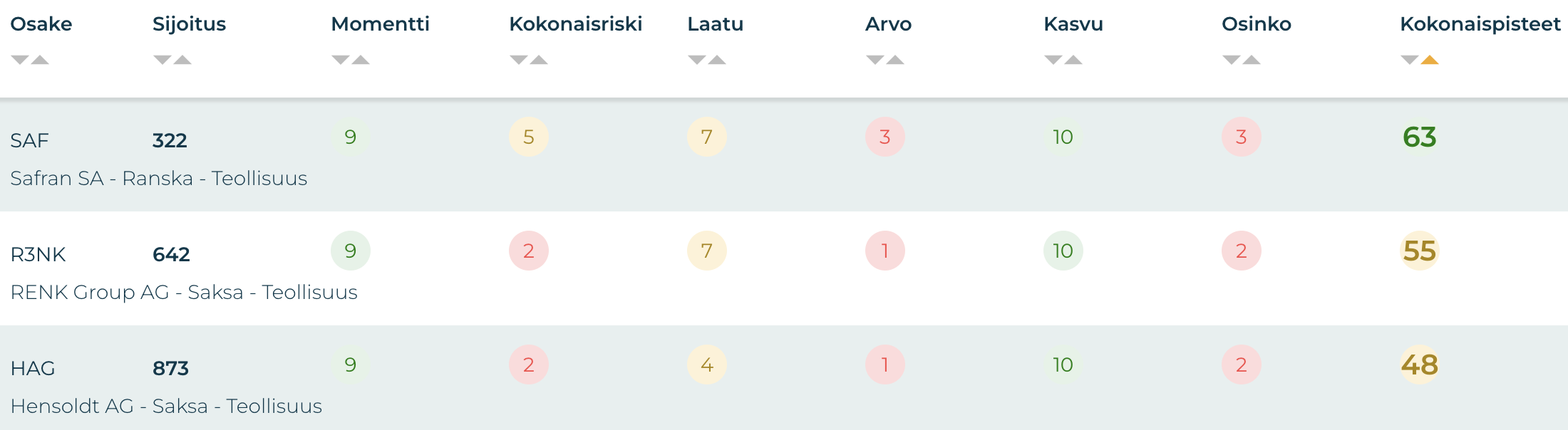 Kolmen osakkeen sijoitusprofiilit ovat pisteiden valossa melko samankaltaiset. Kaikkien osakkeiden momentit ovat koholla puolustusteollisuuden vireen ansiosta. Suosion takana on ennen kaikkea geopoliittisten jännitteiden yhtiöille tuoma lisäsysäys kasvuun, josta kaikilla kolmella osakkeella on täysi kymppi liikevaihdon kolmen vuoden liukuvan vuosikasvun yltäessä yli 15 prosenttiin jokaisen kohdalla.