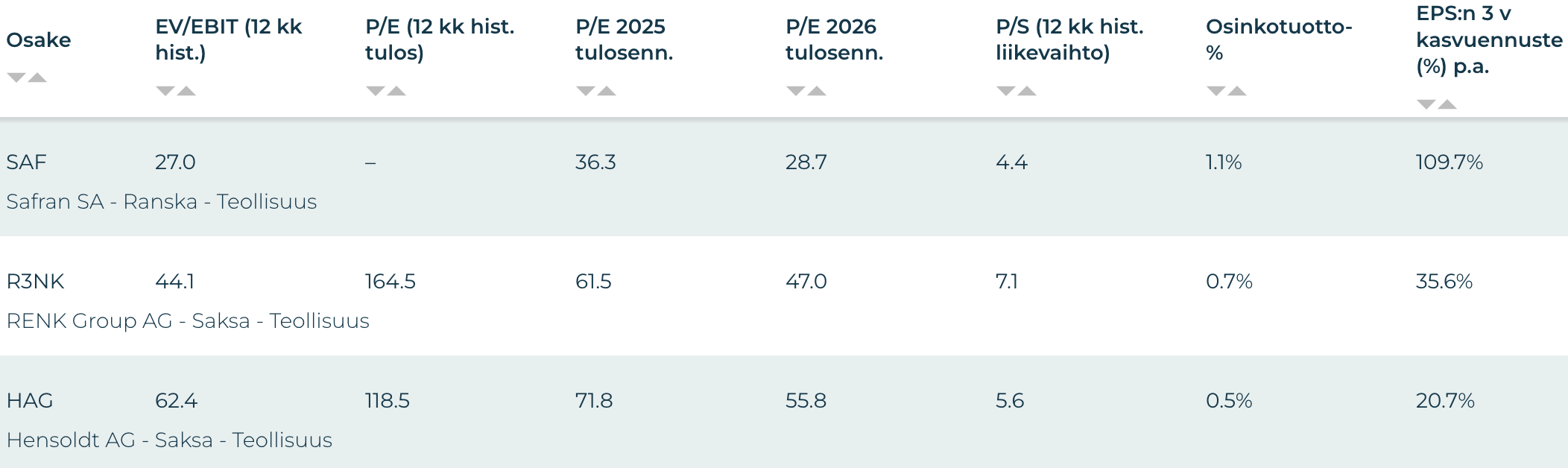 Safranin P/E kuluvan vuoden tulosennusteilla on 36,3 ja 12 kuukauden historiallinen EV/EBIT 27, kun taas RENK:n vastaavat luvut ovat 61,5 ja 44,1 ja Hensoldtin vielä korkeammat 71,8 ja 62,4. Liikevaihtoon suhteutettuna RENK hinnoitellaan selvästi korkeimmalle (P/S 7,1), Hensoldt puolitoista yksikköä alemmaksi (P/S 5,6) ja Safran matalimmalle (P/S 4,4). Safranin vakaampi tuloskunto ja nettokassa tukevat arvostustasoa, kun taas RENKin ja Hensoldtin kertoimet nojaavat vahvasti odotuksiin tulevasta kasvusta. Ottaen huomioon Hensoldtin kannattavuutta epävakauttavat rahoituskulut RENK:n korkea arvostus on jokseenkin helpommin perusteltavissa.