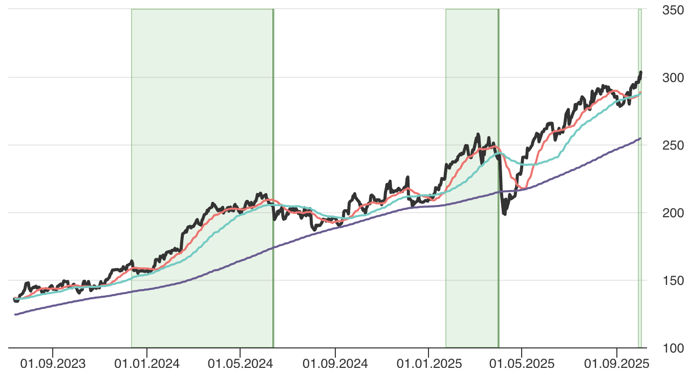 Tällä hetkellä kurssi lähestyy yliostetun rajaa, minkä vuoksi lyhyen aikavälin tuotot maksimoivaa ostopaikkaa kannattaa harkita ylikuumentuneen tilan purkavan korjauksen kautta. Paluu elokuun huipuille 290-294 euron sektorille taikka SMA50:n tuntumaan (tällä hetkellä 288 eurossa, mutta nousee luultavasti ennen kurssin kohtaamista) voisivat tarjota paikan hypätä kyytiin.
