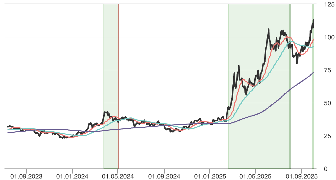Tällä kertaa kesäkuun huipusta ollaan päästy yli, vaikkakin täpärästi. Kurssi liikkuu siis jälleen uusissa huippulukemissa lähestyen tasaisesti yliostetun rajaa. Korjaus takaisin kesäkuun huipulle noin 106 euroon voisi tarjota paremman ostopaikan. Koska ylitys ei ainakaan vielä ole ollut merkittävä, ei korjaus vanhalle huipulle välttämättä riitä. Tuki voi löytyä myös lyhyemmän aikavälin liukuvista keskiarvoista (SMA20 tällä hetkellä 97,50 euroa ja SMA20 92,50 euroa). SMA200:n tuelle on tästä reippaasti matkaa. Samanlaisen nosteen jatkuminen vaatii katalyytteja.