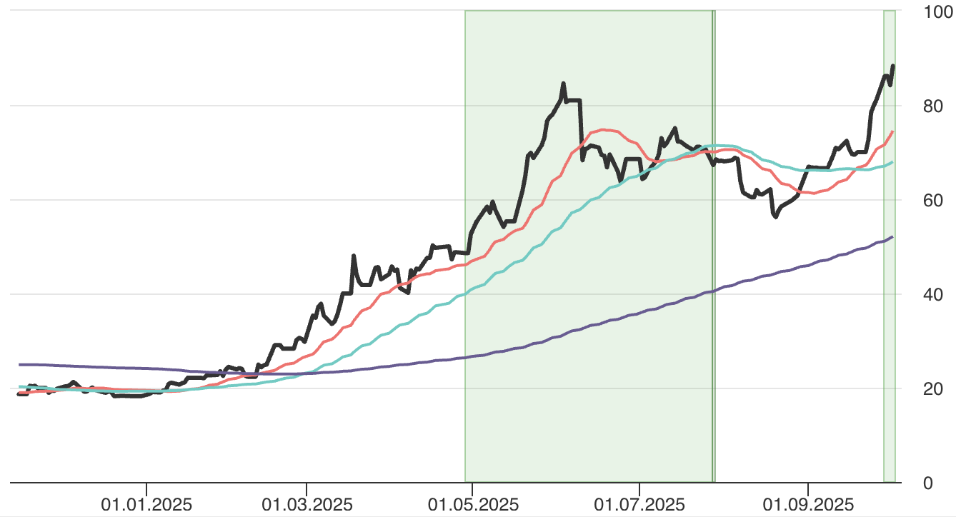 Huhtikuun pohjalta nykypäivään kurssi on noussut peräti 50 prosenttia. Kurssi kävi syyskuun alkupuoliskolla testaamassa SMA50:n tukea pysyteltyään pitkään RSI:llä mitattuna yliostetun rajapinnassa. Tukitaso piti ja kurssi jatkoi vahvaa nousuaan muodostaen uutta historiallista huippua mennessään.