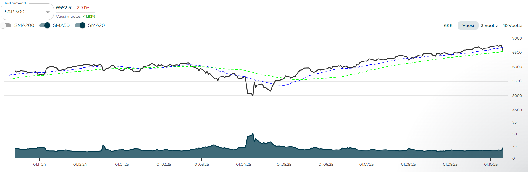 S&P 500 -indeksi laski 2,71 prosenttia 6552 pisteeseen ja alle SMA20:n tason. Indeksi lähestyy SMA50, joka on 6529 pisteessä.