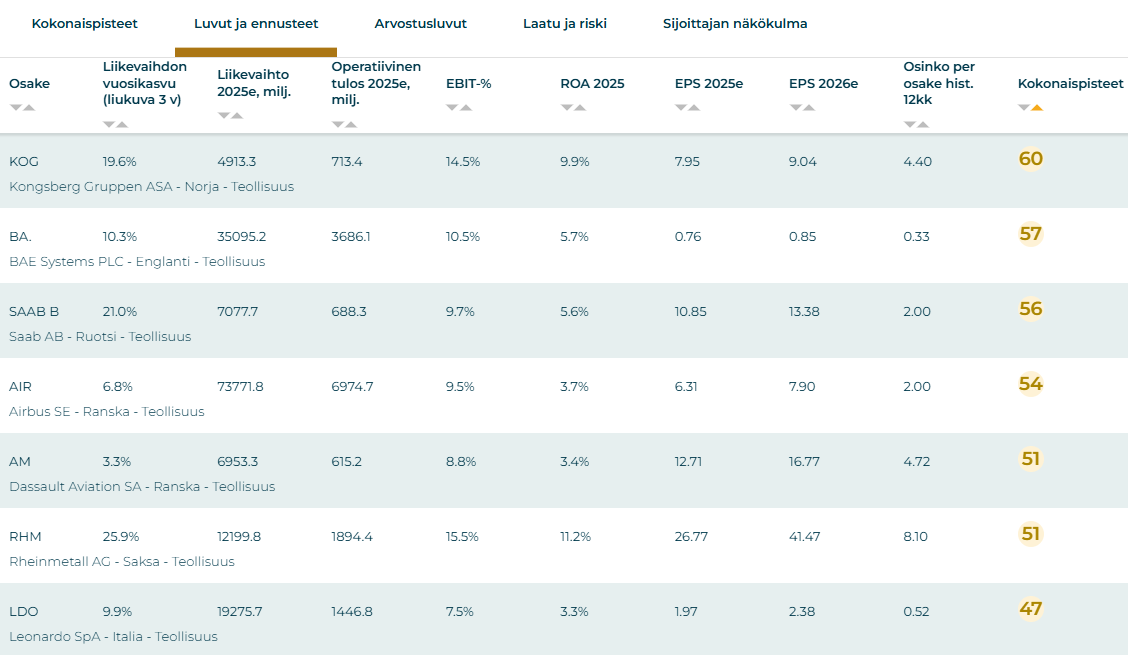 Kuuman megatrendin tuki näkyy puolustusteollisuuden yhtiöiden saamissa analyytikkoennusteissa päättyvälle vuodelle. Vertailun tunnettujen eurooppalaisten puolustusyhtiöiden konsensusennusteet povaavat merkittävää liikevaihdon ja -tuloksen kasvua kaikille seitsemälle yhtiölle. Ajantasaiset ennusteet löydät Sijoittaja.fi:n jäsenyyteen kuuluvan kansainvälisten osakkeiden Osaketyökalun välilehdeltä ”Luvut ja ennusteet”.