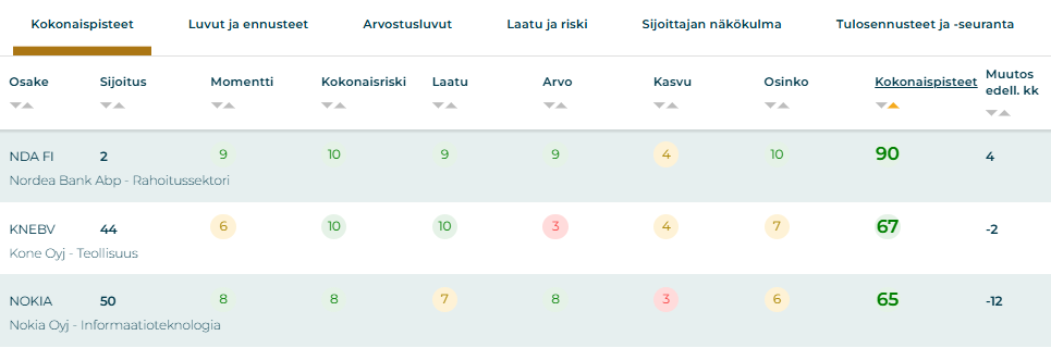 Sijoittaja360-palvelun Osaketyökalussa ovat lähes kaikki Helsingin pörssin päälistan osakkeet. Osaketyökalun Tulosennusteet ja -seuranta -välilehti sisältää kaiken olennaisen tuloskaudelta.