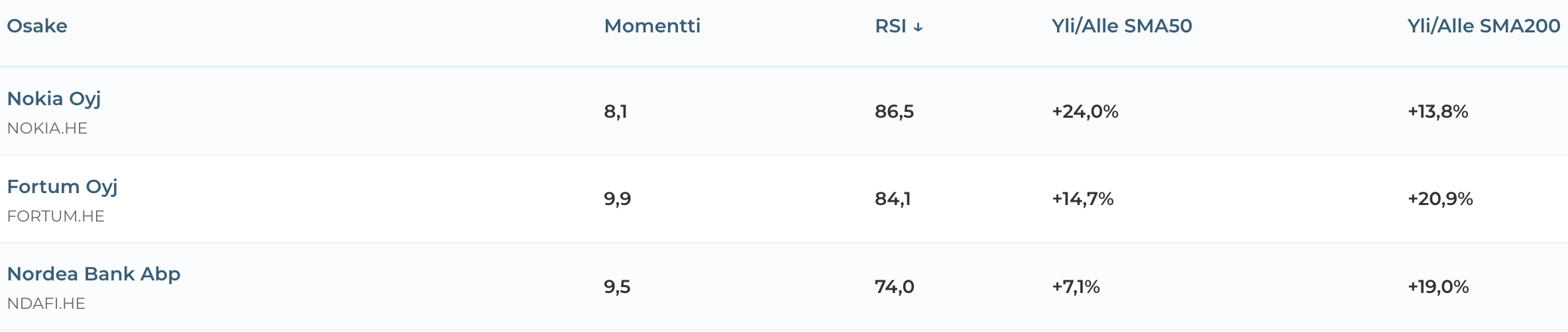 Analyysiin valittiin kolme Helsingin pörssin yliostetuinta osaketta. Kriteerinä käytettiin viimeisen 14 päivän jaksolta laskettua Relative Strength Indexiä 16.10.2025 close-hinnalla. Kolmen kärjessä ovat tällä hetkellä: Nokia, Fortum sekä Nordea.