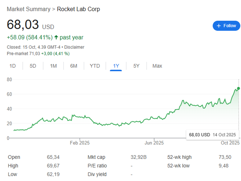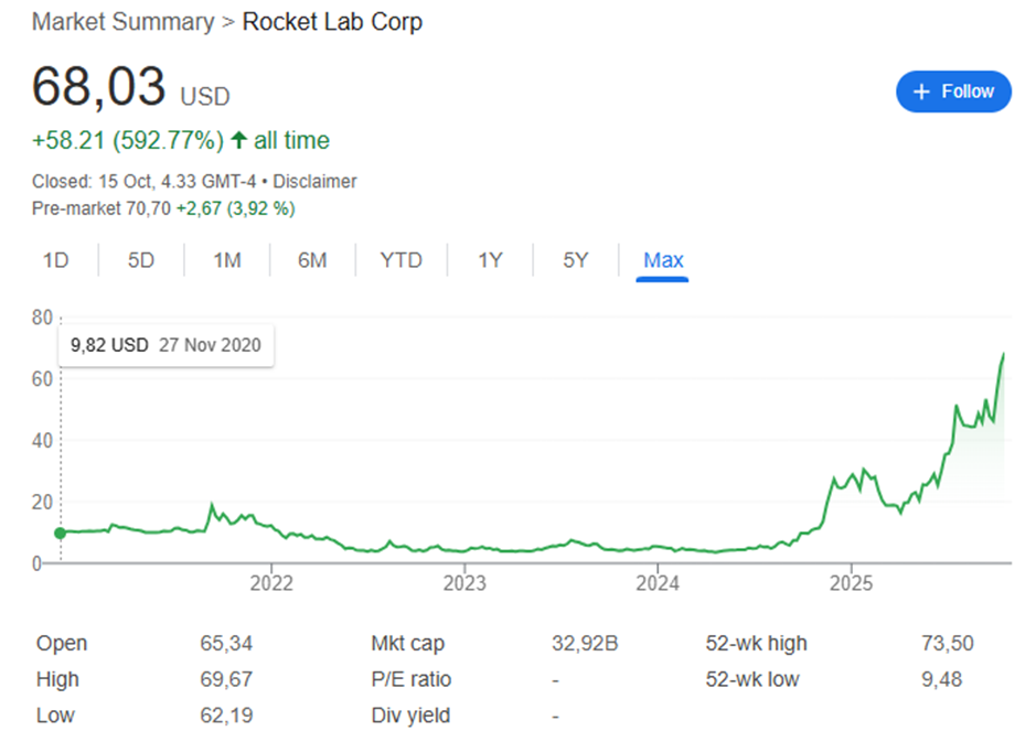 Pörssihistoriansa aikana Rocket Labin osake on noussut jyrkästi noin 9,82 dollarista vuoden 2020 lopussa yli 68 dollariin lokakuuhun 2025 mennessä. Tämä tarkoittaa lähes 600 prosentin nousua. Yhtiön markkina-arvo on kohonnut noin 33 miljardiin dollariin.