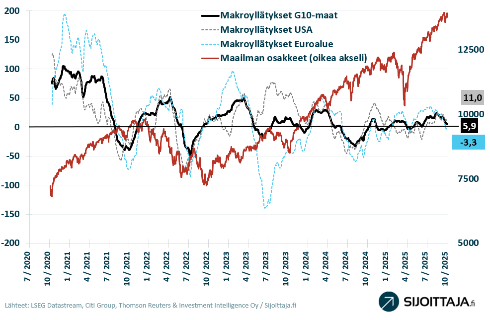 Euroalueella kehitys on kääntynyt jo negatiiviseksi, mikä tarkoittaa, että julkaistut talousluvut ovat jääneet odotuksista.