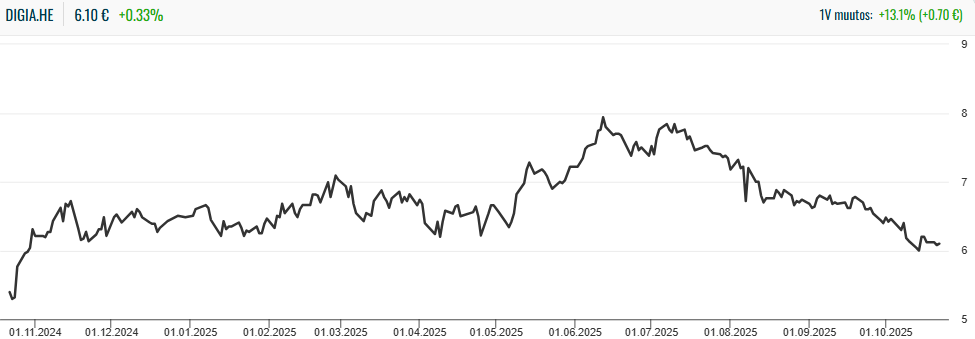 Vuoden 2025 kolmannella kvartaalilla Digian liikevaihto oli 49,3 M€ (ennuste 50,0 M€) ja liikevoitto 4,3 M€ (ennuste 6,0 M€). Heinä-syyskuussa Digian liikevaihto kasvoi 8,4 prosenttia ennätyksellisestä vertailukaudesta. Orgaanisesti liikevaihto pysyi vertailukauden tasolla.