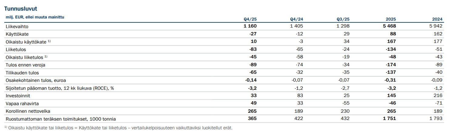 Käyttökatteen parannuksen vuoden 2026 ensimmäisellä neljänneksellä odotetaan hyötyvän pääasiassa elpyvistä ruostumattoman teräksen toimitusmääristä, joiden ennakoidaan kasvavan 20–30 % vuoden 2025 neljännestä neljänneksestä.