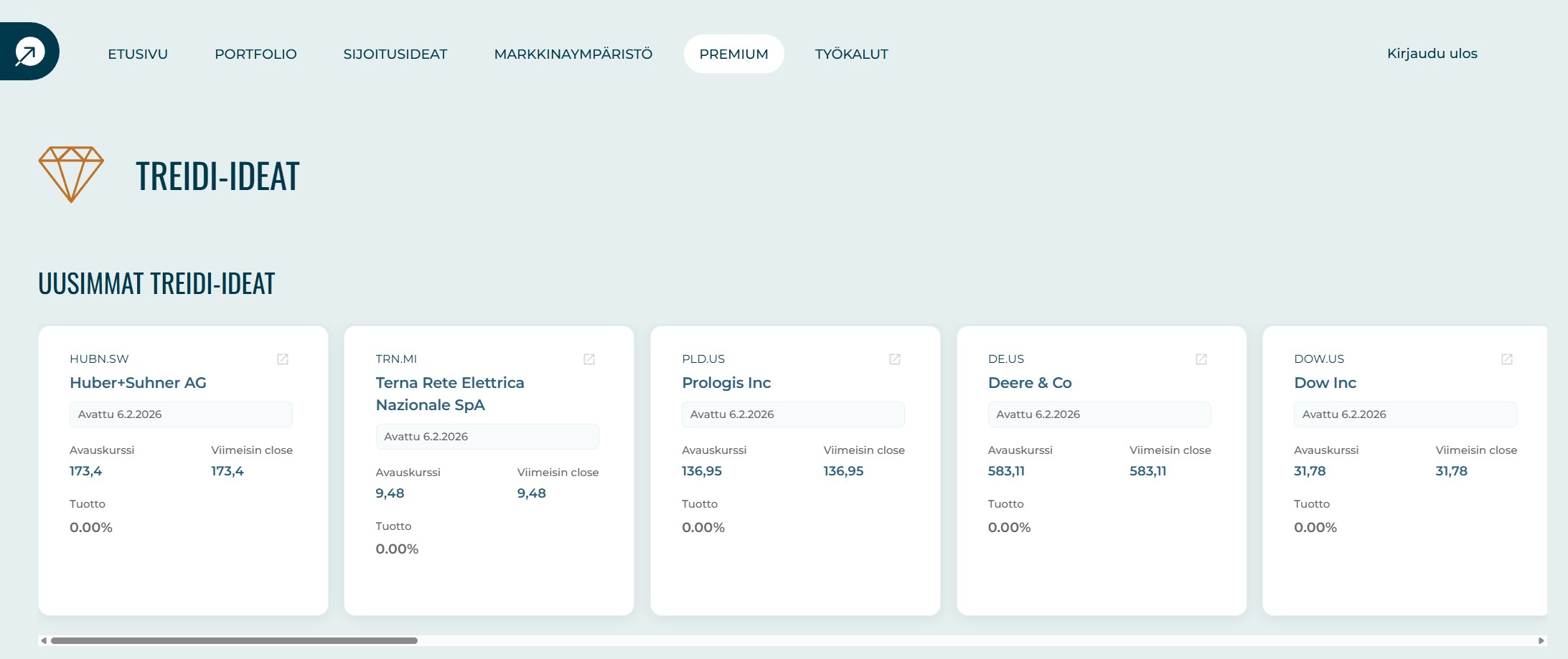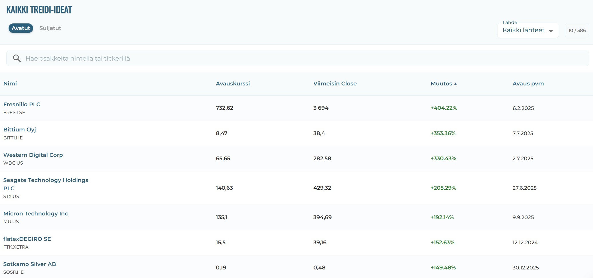 - Suljetut treidi-ideat – jo päättyneet ideat. Näistä näytetään avauskurssi, sulkukurssi, sulkupäivämäärä ja toteutunut tuotto.
