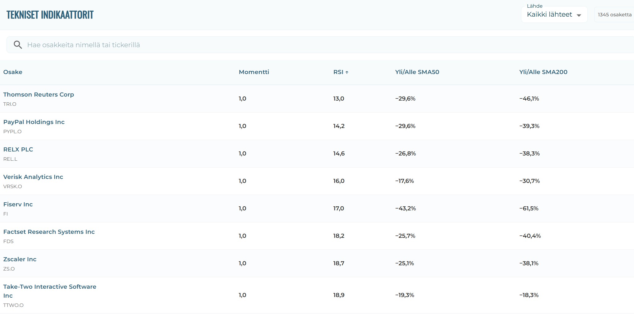 Sijoittaja voi myös tutkia Premium -ympäristössä osakkeita teknisten indikaattorien perusteella. Sijoittaja voi helposti esimerkiksi tutkia, mitkä markkinan osakkeista ovat teknisesti ylimyytyjä tai -ostettuja tai mitkä osakkeet kauimpana liukuvista keskiarvoista.