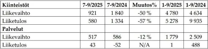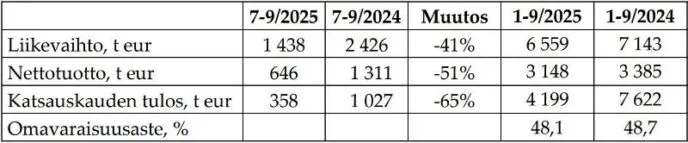 Heinä-syyskuussa 2024 raportoitu tulos oli 1,0 miljoonaa euroa. Johdon mukaan 0,6 miljoonan euron erotus vuoden takaiseen selittyy juuri Apitaren tulosvaikutuksen poistumisella. Kolmannen kvartaalin 2025 tulos vastasi vuositasolle muunnettuna viiden prosentin oman pääoman tuottoa. Se ei ole konsernin kymmenen prosentin tavoitteen mukainen, mutta mainitun irtautumisen jälkeen johto pitää sitä kohtalaisena suorituksena. Juoksevan liiketoiminnan suunta on oikea.