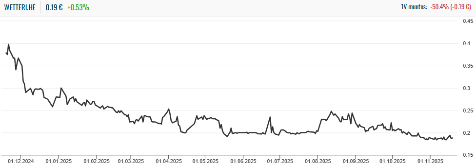 Vuonna 2025 Wetterin osakekurssi on pysynyt pitkälti laskussa. Lokakuun lopulla osake painui markkinoiden mukana alle 0,20 euron, tason, josta kurssi on aiemmin saanut tukea.