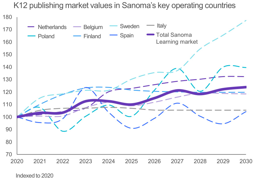 Myös muilla markkina-alueilla oppimateriaalien markkinoiden arvioidaan kehittyvän vakaasti tai kasvavan. Kuten Sanoman esittämästä kuvaajasta huomataan, ovat Espanjan ja Puolan opetussuunnitelmauudistukset kuitenkin merkittävimmät ajurit, joiden odotetaan nostavan yhtiön oppimisliiketoiminta (violetti viiva) ensi vuonna nousuun. Kuvaajan perusteella nopeimmin markkina kasvaa lähivuosina Ruotsissa, mutta Sanoman markkinaosuus on alueella vielä verrattain pieni.