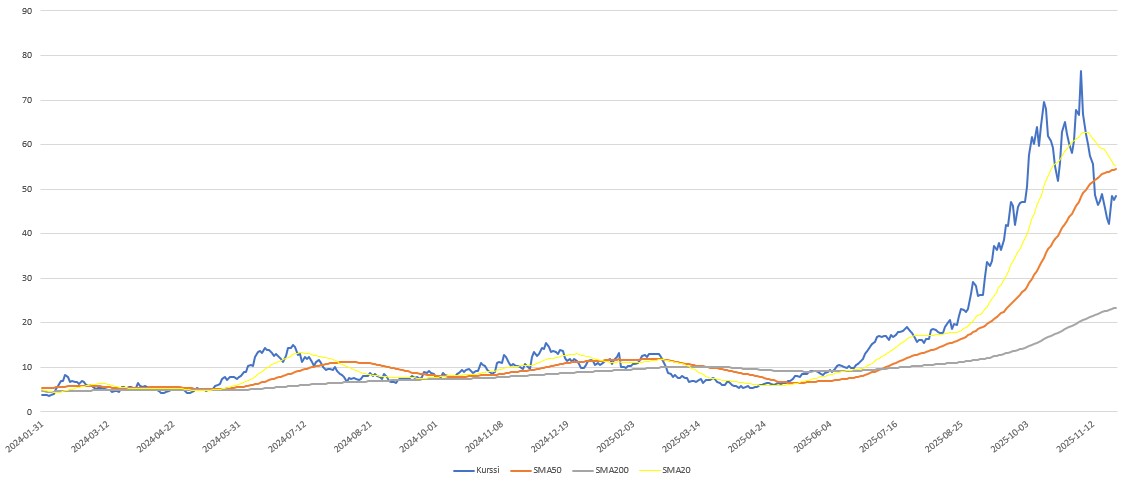 Teknisesti osake palasi takaisin pidemmän ajan nousutrendiin heinäkuussa 2025, kun 50 päivän liukuva keskiarvo nousi 200 päivän liukuvan keskiarvon yläpuolelle. Tämän jälkeen nähtiin kohtuullisen kova korjaus, sillä osake oli kerennyt venyä jo erittäin yliostetuksi. Korjauksen jälkeen osake aloitti hurjan nousunsa — marraskuun alkupuolelle tultaessa osakkeen arvo oli noussut yli 400 prosenttia.