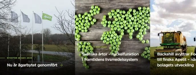Tuoreena pakastettava herne on Apetit Ruokaratkaisut -segmentin keskeinen raaka-aine myös Suomessa – perunan ja porkkanan rinnalla. Jotakin Foodhillsin volyymista kertoo, että Apetitin viljelytavoite Ruotsissa on nyt 4 000 hehtaaria, kun Suomessa herneen viljelyala yhtiön sopimusviljelijöillä on noin 2 000 hehtaaria.