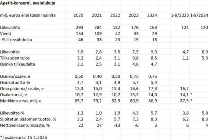 Kuten yhtiö tiedotti tulosvaroituksessaan 12.12.2025, koko vuonna 2025 Apetitin liiketulos ilman yrityskaupan tulosvaikutusta tulee laskemaan 5,6-6,6 miljoonan euron tasolle oltuaan edeltävällä kaudella 9,3 miljoonaa euroa. Tähän vaikuttavat monet syyt, kuten Ruokaratkaisujen satokausituotannon viivästyminen.
