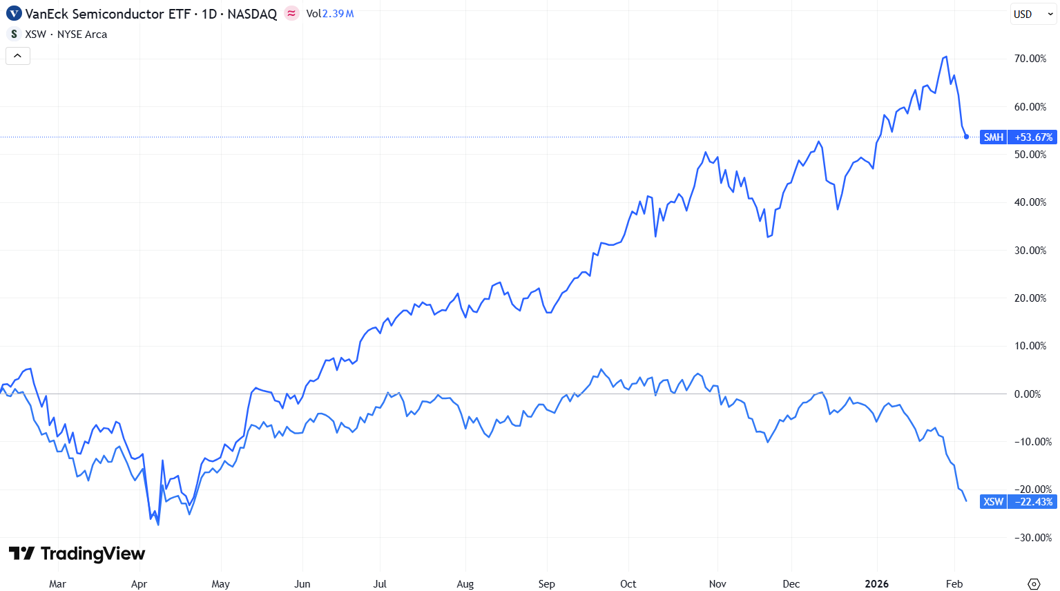 Ohjelmisto-osakkeiden tuottokehitys suhteessa puolijohdeosakkeisiin on historiallisen heikkoa. Alla olevassa kuvassa on puolijohdeosakkeiden kehitystä kuvaavan ETF:n ja ohjelmisto-osakkeiden kehitystä kuvaavan ETF:n tuottokuvaajat vuoden ajalta. Tuottoero viimeiseltä 12 kuukaudelta on 75 prosenttiyksikköä. Puolijohdeosakkeet hyötyvät AI-trendistä. Ohjelmisto-osakkeet kärsivät – ainakin vallalla olevan näkemyksen mukaan.