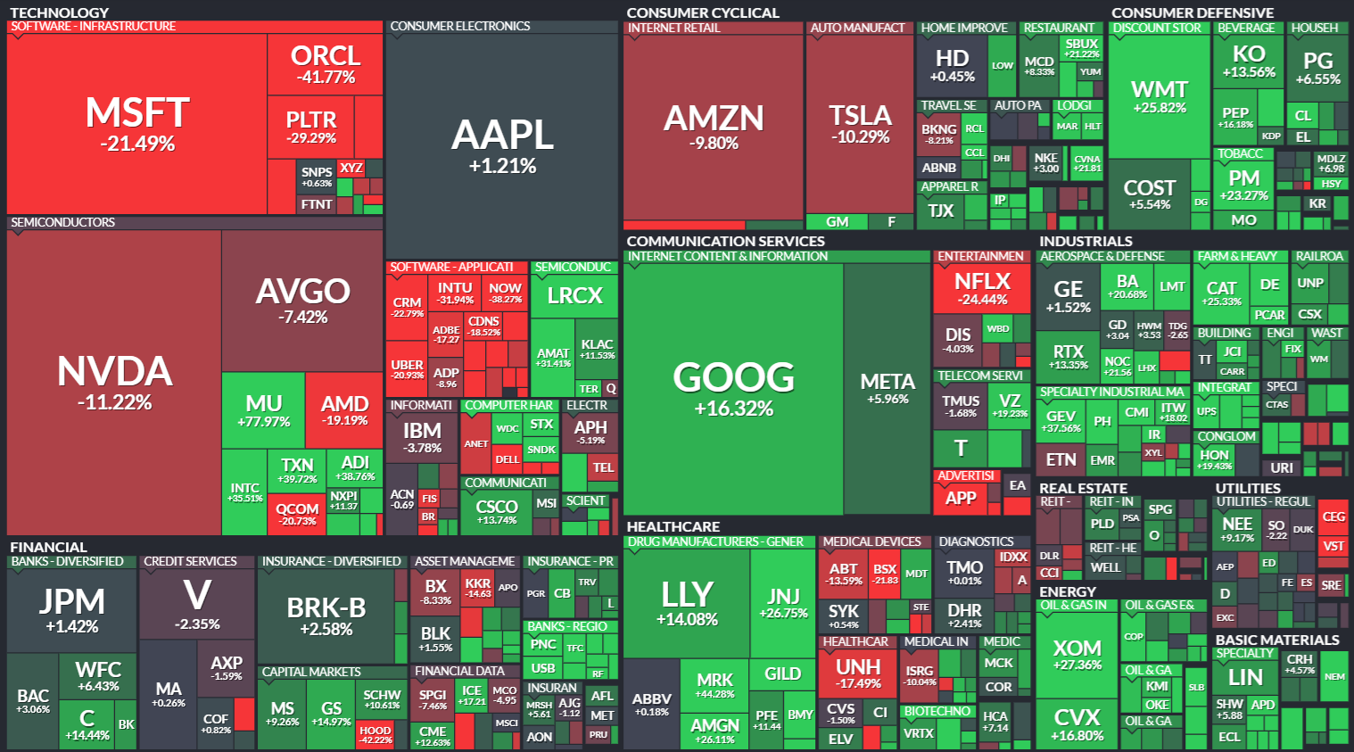 Käynnissä olevan markkinarotaation vaikutuksia havainnollistaa Finvizin S&P 500 -indeksin osakkeiden kolmen kuukauden tuottoja kuvaava taulukko. Monet teknologiasektorin osakkeet ovat syvällä karhumarkkinassa. Oracle on laskenut kolmessa kuukaudessa yli 41 %, Palantir lähes 30 %, Microsoft yli 21 %.