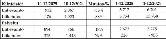 Kiinteistöt-segmentin liiketulos painui kolmoskvartaalin 0,58 miljoonasta 0,48 miljoonaan euroon, mutta viimeinen neljännes sisältää käyvän arvon muutoksia -0,15 miljoonaa euroa perustuen AKA-auktorisoitujen kiinteistöarvioijien arvonmäärityksiin, toisaalta myös positiivista alv-palautusta 0,13 miljoonaa euroa.