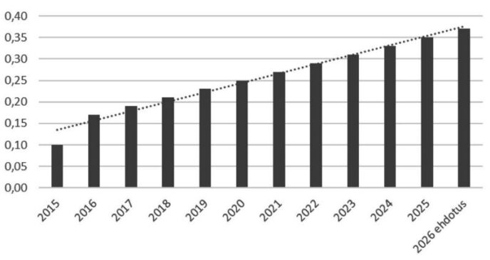 Vuosi sitten perusosinko oli 0,35 euroa osakkeelta. Nyt esitys on 0,37 euroa. Se tekee yhteensä 2,36 miljoonaa euroa osakemäärän ollessa 6,39 miljoonaa. Summa on tarkoitus jakaa kahdessa erässä, kuten viime vuonna.