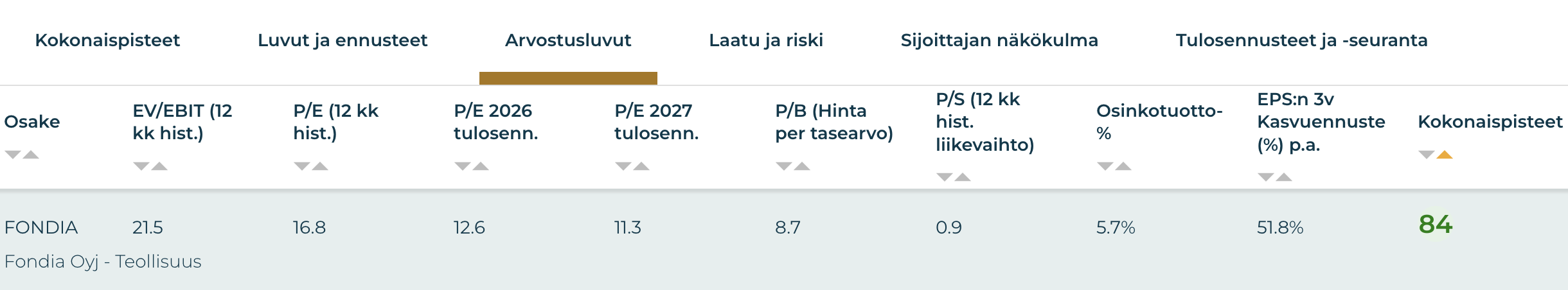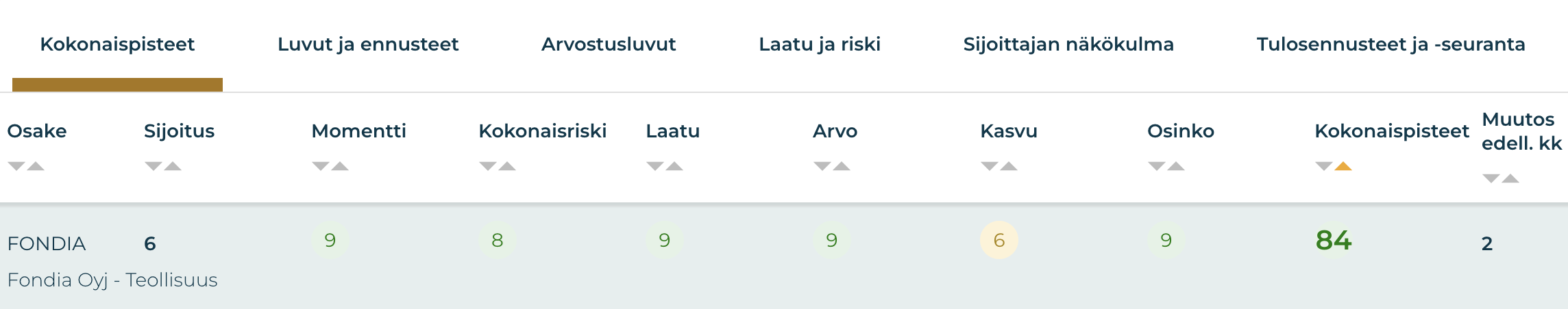 - Fondia ansaitsee huippupisteillä (84) kuudennen sijan Osaketyökalun vertailussa – erinomaiset pisteet momentista, laadusta, arvosta ja osingosta.