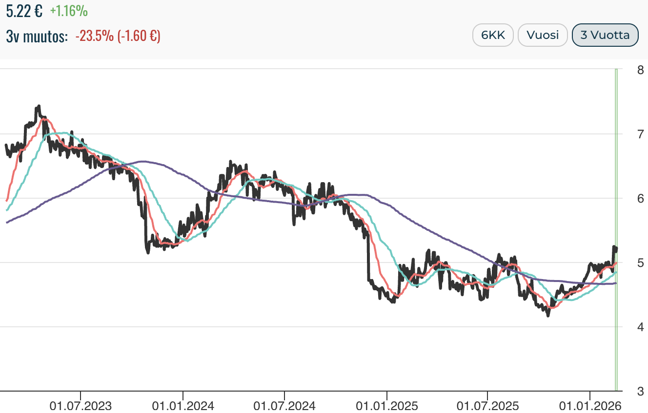 Viime vuosi alkoi läheltä osakkeen kaikkien aikojen pohjalukemia noin 4,50 eurossa seuraten marraskuussa 2024 annettua tulosvaroitusta. Koko vuoden kurssilla oli vaikeuksia päästä selvästi viiden euron yläpuolelle. Kevään ja kesän nousut hyytyivät 5–5,50 euron välille, josta muodostui osakkeelle olennainen paikallinen vastustaso.