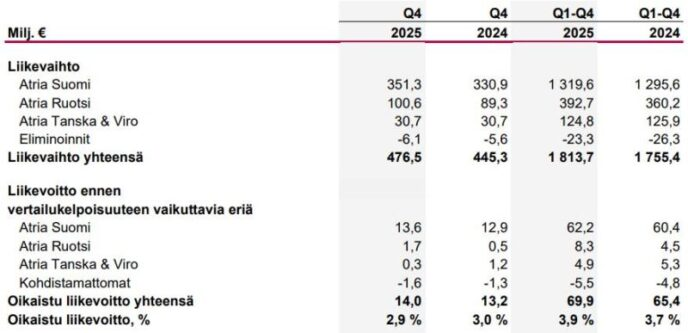 Elintarvikeyhtiö Atria kipusi liikevaihto- ja tulosennätykseen vuonna 2025. Atria Ruotsi lähes tuplasi liikevoiton.