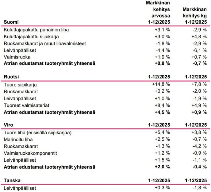 Olosuhteet isoimmalla markkinalla Suomessa kohenivat loppuvuotta kohden. Atrian edustamien tuoteryhmien kehitys vähittäiskaupassa arvossa mitattuna oli tammi-toukokuussa -1,7 prosenttia, tammi-elokuussa -0,3 prosenttia mutta koko vuonna 2025 jo plussalla 0,8 prosenttia.