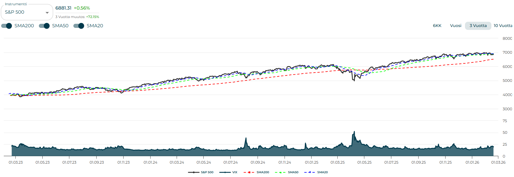 S&P 500 on pitkällä aikavälillä vahvassa nousutrendissä (nykyinen arvo selvästi SMA 200:n yläpuolella), mutta lyhyellä aikavälillä nähdään pieni heikentyminen indeksin ollessa lyhyen aikavälin liukuvien keskiarvojen alapuolella (kurssi on juuri SMA 20:n ja 50:n alapuolella).