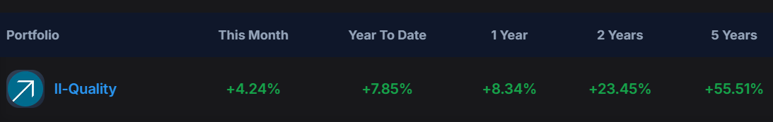 II-Quality on Sijoittaja.fi:n ylläpitämä globaaleihin laatuosakkeisin sijoittava salkku. Salkku tavoittelee pitkäjänteistä, suhteellisen vakaata tuottoa osakkeilla, joilla on tyypillisesti: