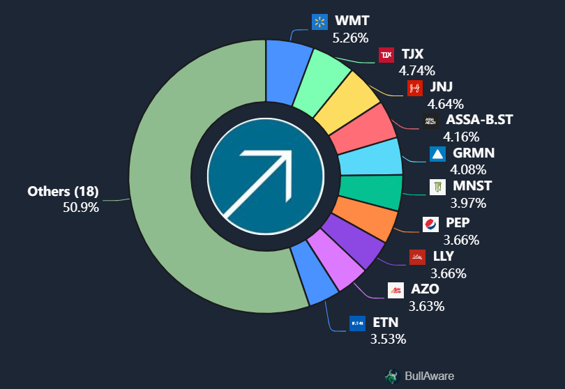 Sektorijakauma on selvästi defensiivinen/laadukas: Salkun tärkeimmät painot ovat vähittäiskaupassa, teollisuudessa, päivittäistavaroissa, terveydenhuollossa ja sähkö-/energia-alalla (yhtiöt, jotka tuottavat ja siirtävät sähköä). Mukana on myös teknologiaa, mutta se on enimmäkseen yrityksille suunnattuja ohjelmistoja ja palveluja – ei niinkään sellaisia nopeasti kasvavia “kuumia” teknologiaosakkeita, jotka heiluvat voimakkaasti markkinan mukana. Lisäksi salkussa on käteistä 6,85 %, mikä antaa puskuria ja joustoa ajoitukseen/rebalansointiin.