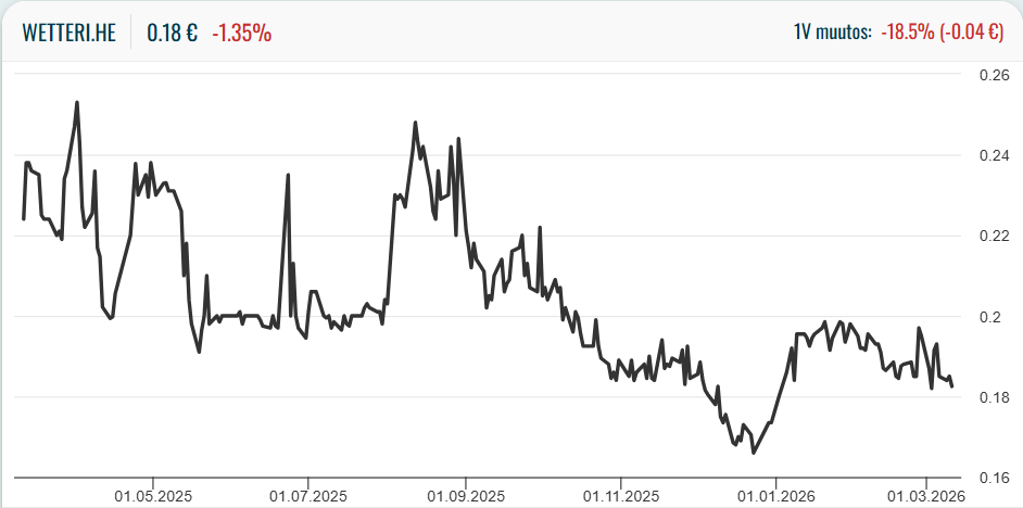 Wetterin osakekurssi on ollut laskutrendissä viimeisen vuoden aikana. Osake starttasi vuoteen 2025 noin 0,28 euron tasolta, mutta aiempi vaihteleva tuloskehitys, ohjeistusmuutos ja negatiivinen tulosvaroitus sekä autoalan epävarma markkina ovat luoneet laskupainetta kurssiin. Toisaalta Wetterin velkatilanteen keveneminen, tehostamistoimet ja tuloskäänneodotukset ovat ajoittain tukeneet kurssia. Kokonaisuutena tarkastellen osakkeen volatiliteetti on ollut korkea.