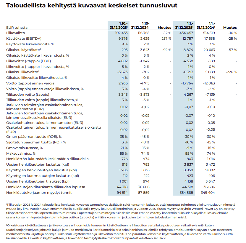 Neljännellä kvartaalilla Wetterin jatkuvien liiketoimintojen liikevaihto jatkoi kasvussa ja ylitti odotukset. Oikaistu kannattavuus jäi kuitenkin ennusteista, kun vaihtoautoliiketoiminnan muutostoimenpiteet, varaston tervehdyttäminen ja vaikea toimintaympäristö rasittivat tulosta. Toteutetut tehostamistoimet luovat tukea vuoden 2026 tuloskäänteelle.