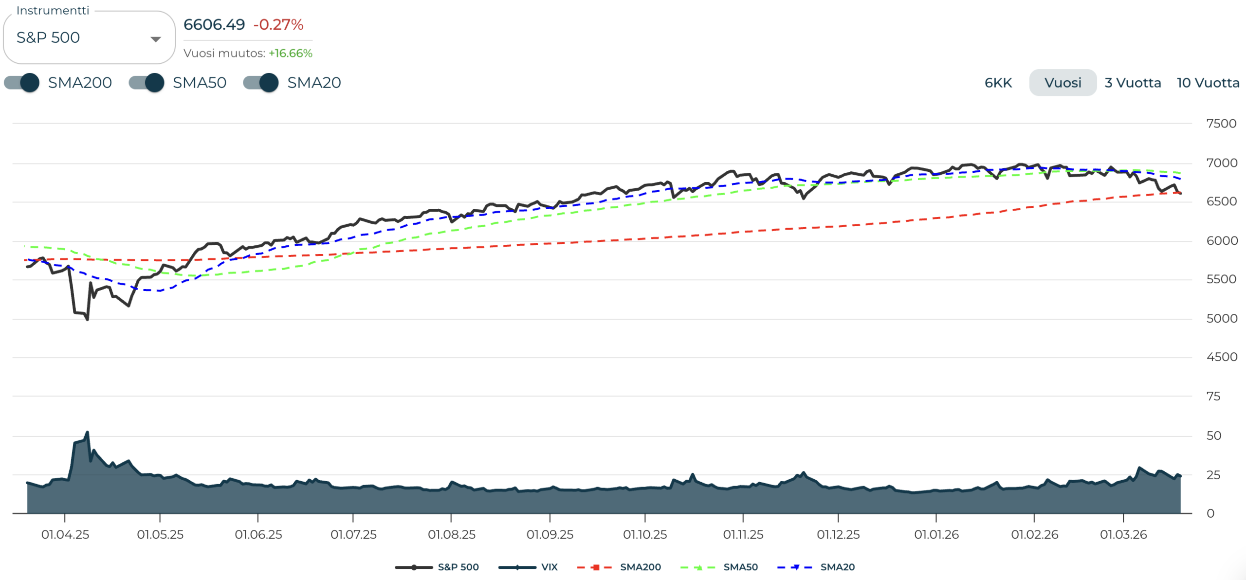 Toiseksi konflikti on lisännyt geopoliittista epävarmuutta, mikä on heikentänyt sijoittajien riskinottohalukkuutta ja lisännyt markkinoiden volatiliteettia. Tämä on heijastunut muun muassa Sijoittaja360:n Markkinaympäristössä seurattavissa olevaan markkinariski-indikaattoriin, joka on maaliskuun aikana jatkanut jyrkkää nousua kohti ”vältä osakkeita” -tilaa. Myös VIX on pysytellyt sinnikkäästi yli 25 raja-arvon, viestien korkeasta markkinaepävarmuudesta.