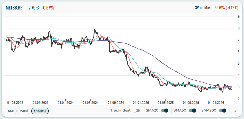 Metsä Boardin osake on ollut melko tarkkaan kaksi vuotta laskutrendissä. Kurssikäännettä ei ole vielä nähtävissä, mutta kurssitaso on stabiloitunut kolmen euron tuntumaan, jonka molemmin puolin kurssi on liikkunut markkintatilanteesta riippuen.