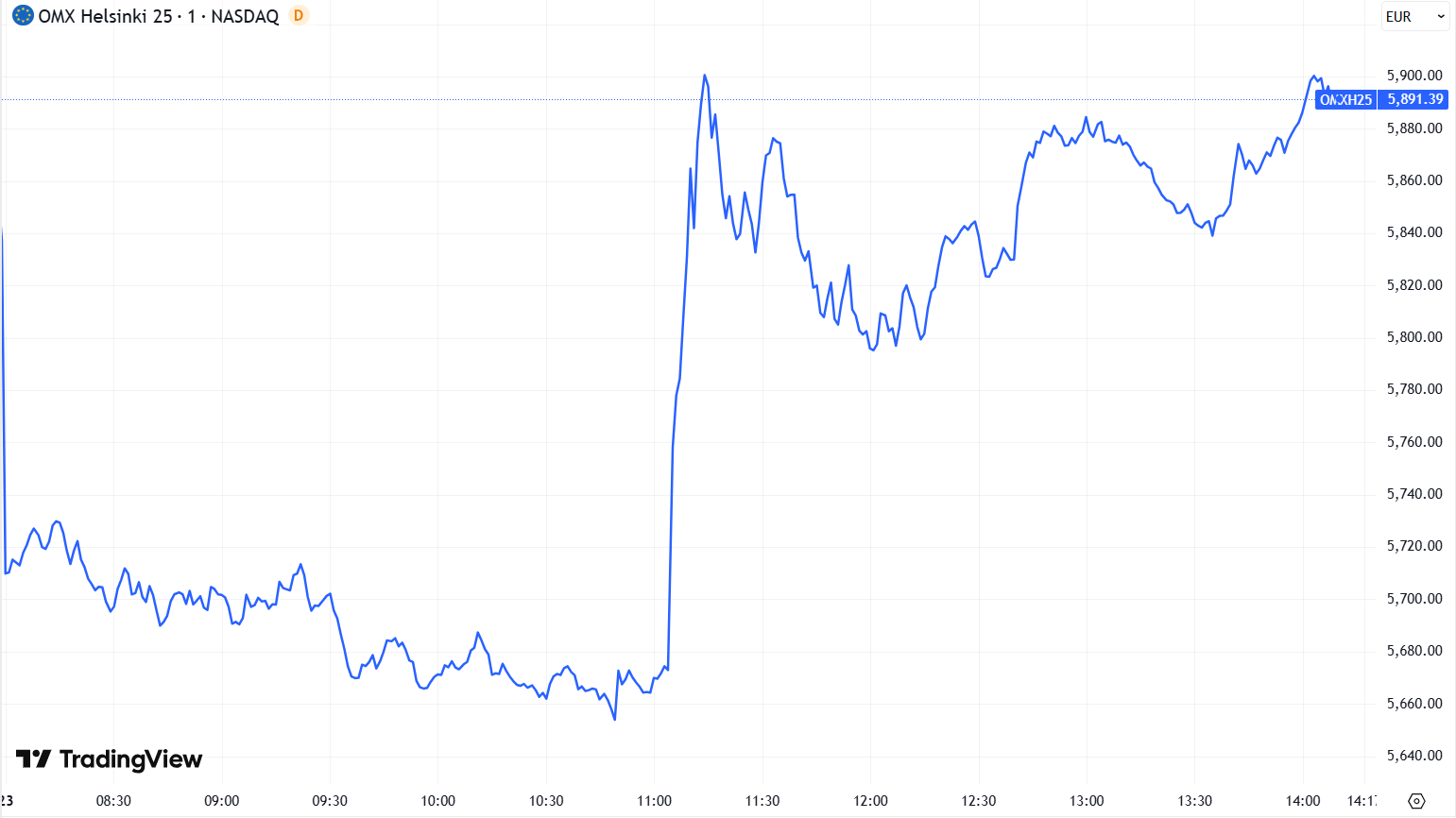 OMX Helsinki 25 -indeksi nousi pohjilta yli 4 prosenttia muutamassa minuutissa