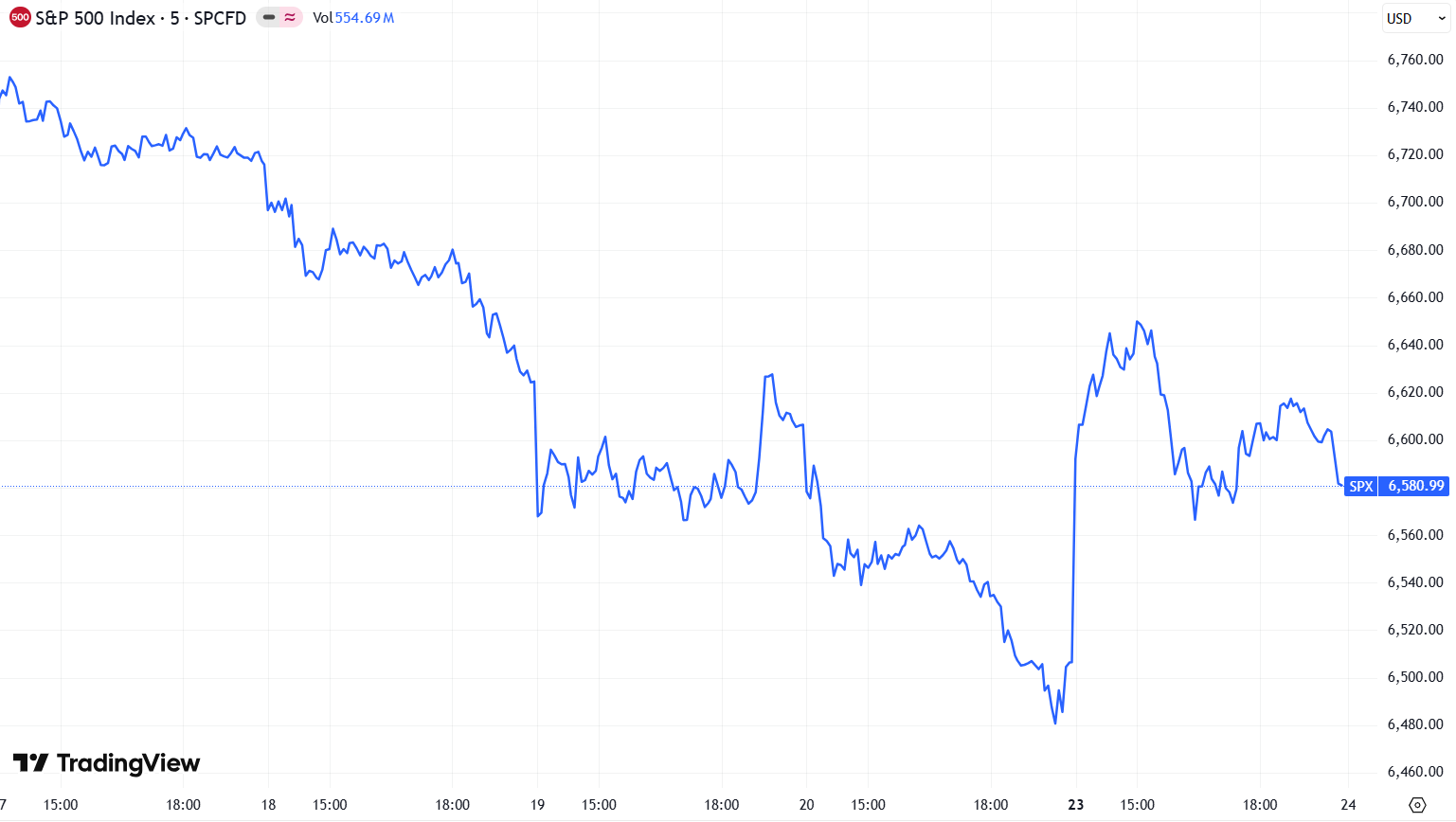Markkinat reagoivat eilen positiivisesti Trumpin Truth Social-alustalla tekemiin julkaisuihin iskujen lykkäämisestä. S&P500 otti peräti +1,15 prosentin harppauksen maanantain aikana, kun taas Nasdaq 100 palautui +1,22 prosenttia ja Dow Jones -indeksi +1,38 prosenttia. VIX laski 0,63 pisteellä, mutta pysyi edelleen korkealla 26,15 tasolla.