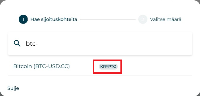 Kryptovaluuttoja on lisätty portfoliotyökaluun, joten voit nyt seurata niitä yhdessä muiden salkkusi sijoitusten kanssa. Näin helposti lisäät kryptot salkkuusi ja saat kokonaisnäkymän sijoituksistasi yhdessä paikassa.