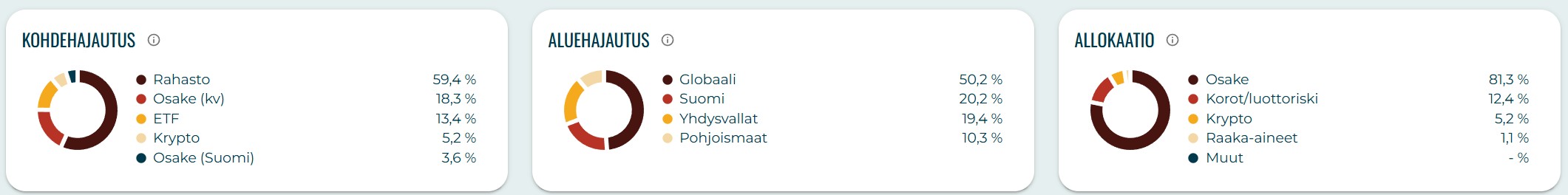 Lisätyt kryptovaluutat näkyvät salkkuyhteenvedossa, jossa ne huomioidaan tuotoissa ja hajautuksessa. Tämä tekee sijoittajan arjesta helpompaa, kun kokonaiskuva salkusta pysyy jatkuvasti ajan tasalla ilman erillisiä laskelmia tai manuaalista seurantaa.