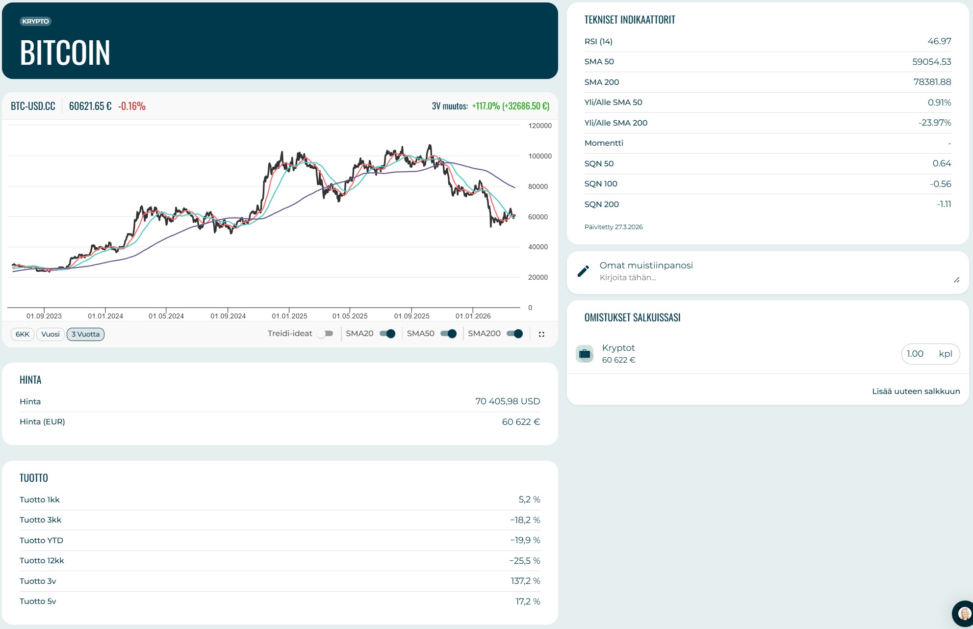 Löydät yhdestä näkymästä kurssikäyrän ja liukuvat keskiarvot, tuottohistorian sekä keskeiset tekniset indikaattorit. Tämä kokoaa olennaisen markkinainformaation yhteen paikkaan ilman tarvetta siirtyä useiden eri työkalujen välillä. Yhdellä vilkaisulla saat kattavan kuvan kryptovaluutan tilanteesta ja sen kehityksestä.