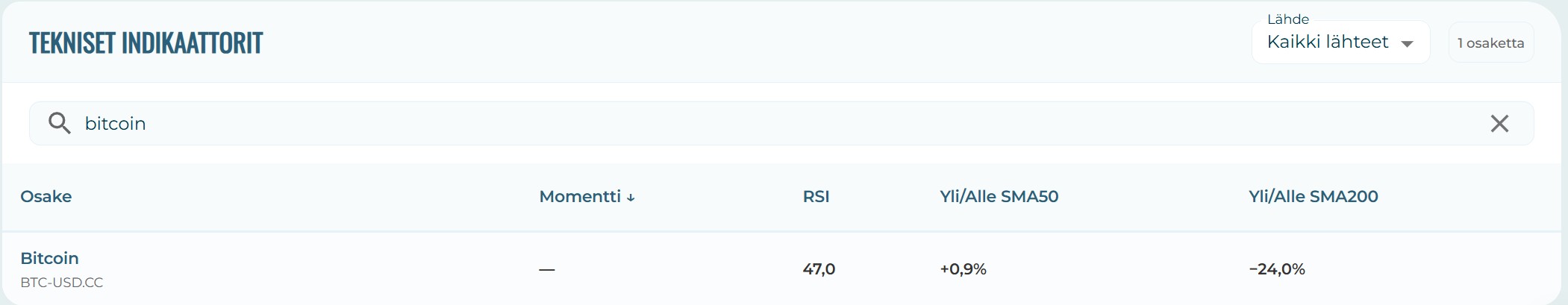 Kryptovaluutoille ei tällä hetkellä lasketa momenttipisteitä, koska työkalussa seurattavien kohteiden määrä on vielä liian pieni luotettavan suhteellisen vertailun tekemiseen. Kun kryptovaluuttojen määrä kasvaa riittävästi, pisteytys voidaan ottaa käyttöön, koska suurempi otos parantaa vertailtavuutta ja antaa oikeamman kuvan markkinasta.