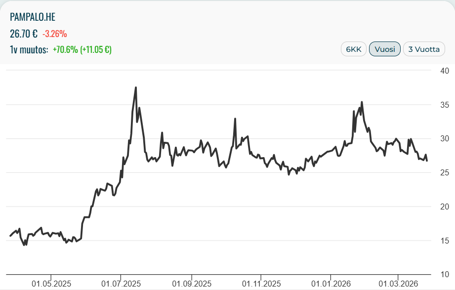 Heinäkuun jälkeen osake on isossa kuvassa tarkasteltuna liikkunut pitkälti vaakasuunnassa 26-35 euron välimaastossa, vaikka matkalle onkin mahtunut nopeita hetkellisiä kurssinousuja. Pääomamarkkinapäivää edeltävänä päivänä Endomines julkaisi vuoden 2025 vuosikertomuksensa ja vaikka julkistus ei tarjonnut markkinoille uutta mullistavaa tietoa, sulki osake noin 3,3 prosentin laskuun 26,7 euroon. CMD-päivänä osake jatkoi maltillisessa, noin 2 prosentin laskussa 26,2 euron tasolla.