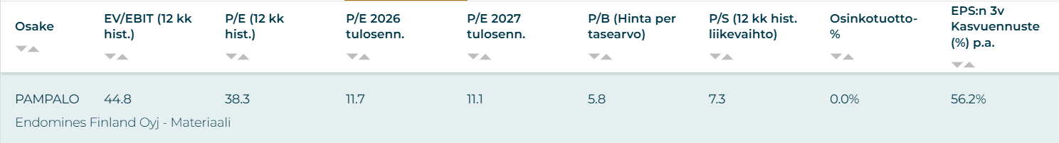 Vuoden 2026 tulosennusteella osakkeen P/E-luku on noin 11,7, mikä on hyvin maltillinen suhteessa Endominesin ennustettuun kasvuun. Sijoittajan on kuitenkin hyvä huomata, että todella voimakkaan ennustetun kasvun myötä arvostustasoon sisältyy huomattavasti epävarmuutta. Tämä heijastuu myös taaksepäin katsoviin arvostuskertoimiin, sillä toteutuneella tuloksella tarkasteltuna osakkeen arvostus on todella korkea (2025 P/E = 38,3).