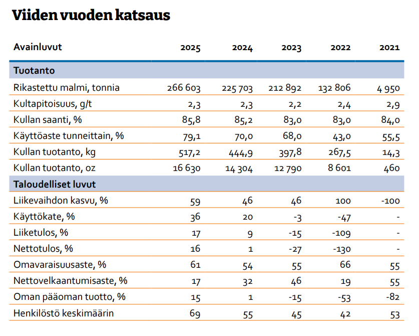 Tämän vaiheen perusteella osakkeen arvostus ei vaikuta kalliilta vaan pidemminkin kohtuullisen edukkaalta. Suurin osa osakkeen potentiaalista kytkeytyy kuitenkin pidemmän aikavälin odotuksiin eli Eteläisen kultalinjan tuotannon avaamiseen vuonna 2030 ja olemassa olevan kultavarannon kasvattamiseen. Myös mahdollinen kriittisten mineraalien tuotannon käynnistäminen luo kasvupotentiaalia.