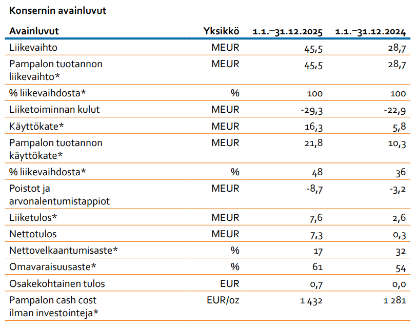 Vuosi 2025 jää Endominesin historiaan käännepisteenä. Yhtiö kasvatti kullantuotantoaan 16,3 prosenttia 16 630 unssiin ja hyötyi poikkeuksellisen vahvasta kultamarkkinasta. Kullan dollarihinta nousi vuoden aikana noin 2 600 dollarista yli 4 300 dollariin, ja koko vuoden keskihinta oli 3 436 dollaria unssilta. Tämän tukemana Endominesin liikevaihto kasvoi 59 prosenttia 45,5 miljoonaan euroon, käyttökate nousi 181 prosenttia 16,3 miljoonaan euroon ja yhtiö teki ensimmäistä kertaa historiassaan yli 7 miljoonan euron nettotuloksen.