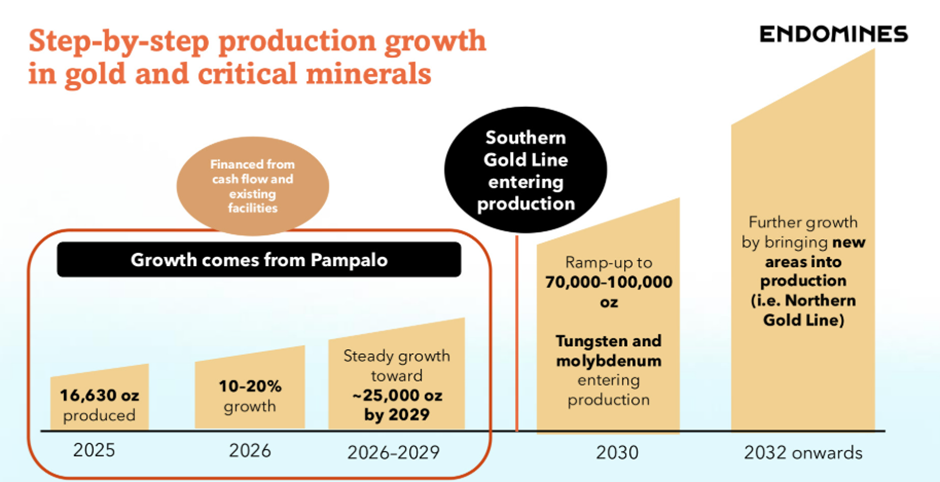 Endominesin pääomamarkkinapäivän keskeinen viesti oli selkeä. Yhtiön kullantuotantoa ja malminetsintää tullaan kasvattamaan huomattavasti tulevina vuosina. Kullantuotannon osalta suunnitelma etenee kahdessa vaiheessa: Pampalon tuotannon kasvu vuosina 2026-2029 ja Eteläisen kultalinjan tuotannon ylösajo vuonna 2030.