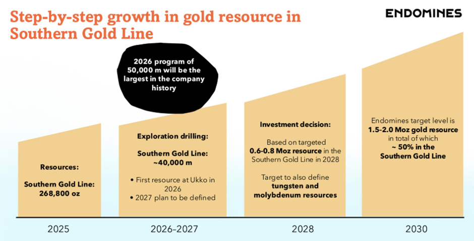 Vuonna 2026 Endomines pyrkii kolminkertaistamaan malminetsinnän kairausmetrinsä edellisvuoden 18 000 metristä 50 000 metriin. Kairausmäärä on huomattavasti aiempia vuosia korkeampi ja yhtiön tavoitteena on kasvattaa sen avulla mineraalivarantojaan selvästi. Malminetsintää keskitetään Eteläiselle kultalinjalle ja tarkemmin Ukkolanvaaralle, josta Endominesin on tarkoitus julkaista ensimmäinen varantoarvio kuluvan vuoden aikana.