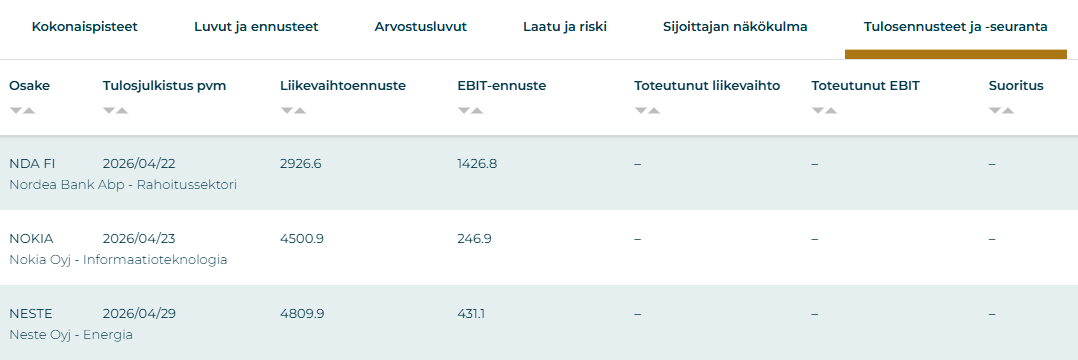 Tulosjulkistuspäivämäärien lisäksi Osaketyökalun Tulosennusteet- ja seuranta-välilehdeltä löydät ajantasaiset analyytikoiden konsensusennusteet yhtiöiden liikevaihdolle ja -tulokselle. Osavuosikatsausten julkistusten myötä sivulle päivitetään myös toteutuneet luvut sekä neljänneksen suoritus suhteessa ennusteisiin. Yhtiöiden tietosivuilta löydät sen sijaan analyytikon koostaman tuloskommentin.